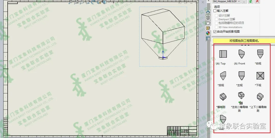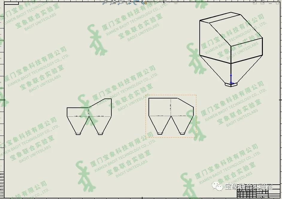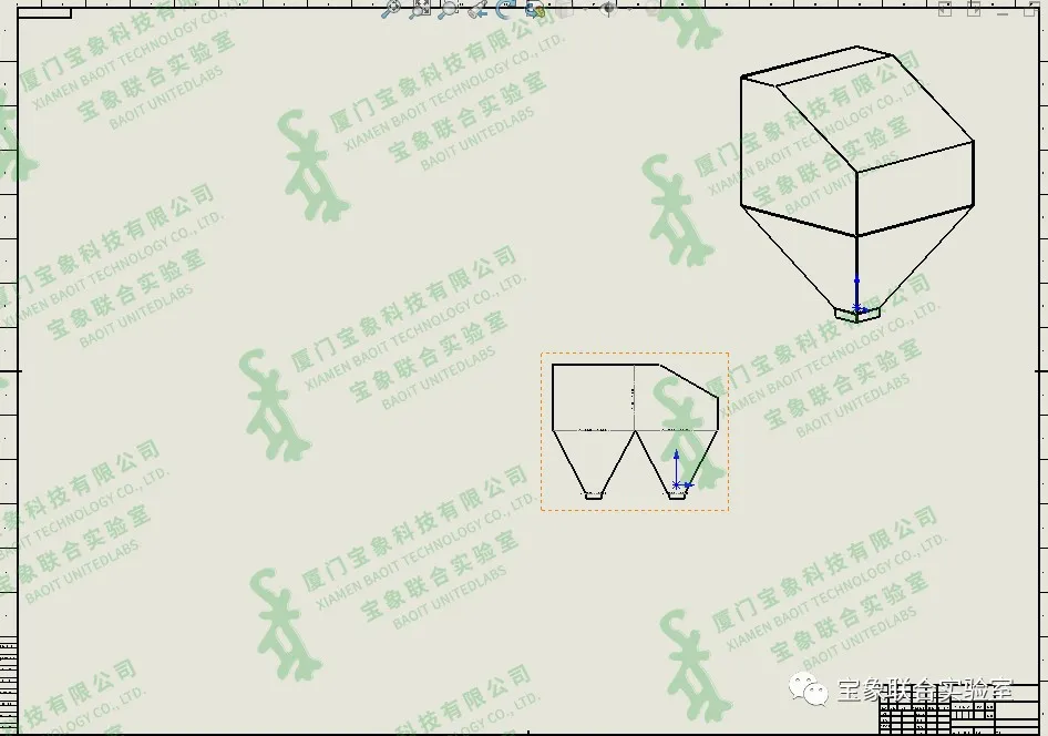 对于新创建的多片钣金件,从下方步骤开始。选择【转换到钣金】,选择固定面后,勾选【保留实体】,则在零件中生成一个新的钣金件,而原来的实体特征仍然存在且可用。   3、重复第2步骤,将另一部分转化为钣金。  4、从零件/装配体新建工程图,打开视图调色板,添加等轴测视图。此时,没有平板型式视图。  5、点击【模型视图】,第一步,选择该多实体钣金零件,第二步,点击【选择实体】。   设计页面跳转至【工程图视图实体】属性卡,选择其中一个钣金。  点击确定后,跳转至【模型视图】,在更多视图中选择平板型式,则导出平板型式工程图视图。   6、重复第5步骤,导出另外一个钣金件的工程图视图。  如上方式所述,我们也可以将这个实体转化为4片钣金件。