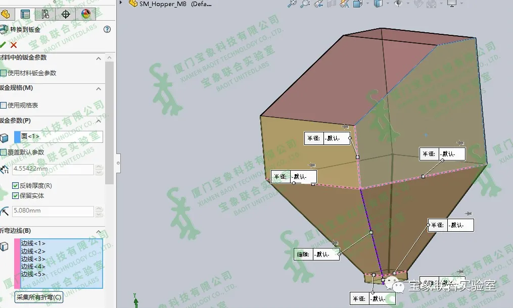 1、首先看下图钣金零件。   下图为该钣金零件的平板型式。通过切割清单—属性--边界框长度,或是下方状态栏,我们可以看到,长度超过3700mm。 对于标准的钣金材料来说,此尺寸太大。   2、将此零件生成为一个多片钣金件。点击设计树中的【转换到钣金】特征,勾选【保留实体】,取消折弯边线选项框中的项目。